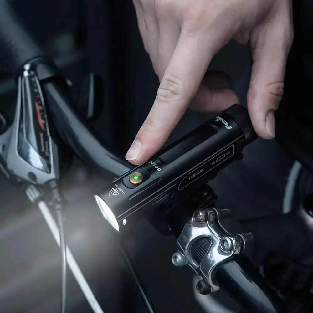 Fenix BC26R pyöränvalon kanssa ei tarvitse räpeltää. Lampun yhdestä käyttökytkimestä käytät lampun kaikkia toimintoja nopeasti ja helposti. Viimeisen käyttötilan muistitoiminto lisää käytön yksinkertaisuutta entisestää, kun yhdellä painalluksella lamppu syttyy aiemmin käytettyyn käyttötilaan. Napin LED-merkkivalosta näet latauksen etenemisen ja jäljellä olevan paristovarauksen määrän käytön aikana.