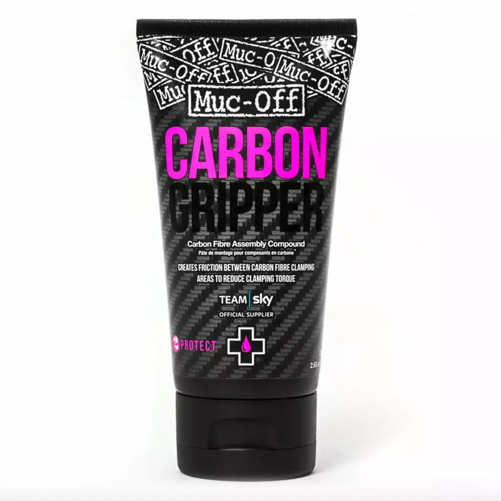 Hiilikuituosille tarkoitettu kitkaa lisäävä Muc-Off Gripper -voide. Voiteen ansiosta hiilikuituosat pysyvät paremmin paikallaan ilman ylikiristämisen vaaraa.