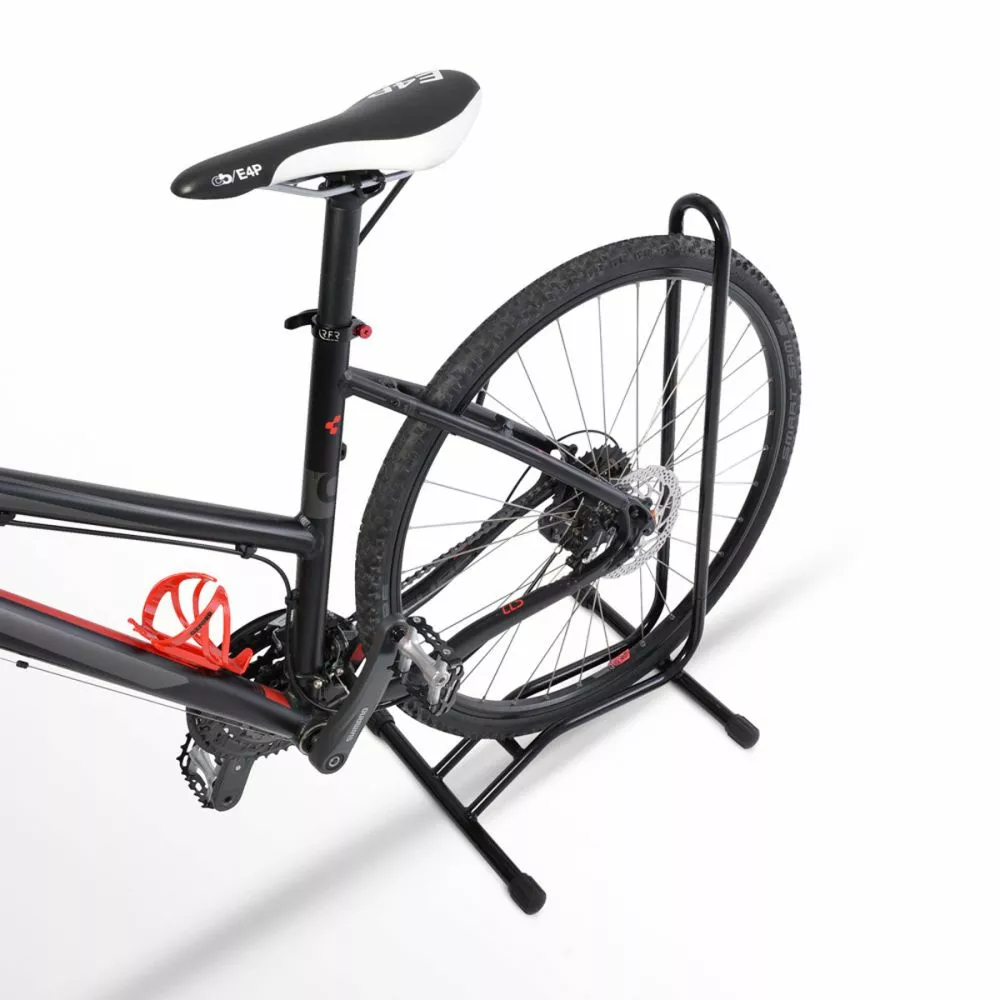 Tukeva ja kevyt lattiateline polkupyörälle. Kevyt teräsputkirakenne ja jaloissa pitävät kumitassut. Sopii 20-29″ pyörille. Maksimi renkaan leveys 2.6″, telineeseen menee myös 2.8″ levyinen rengas, mutta on hieman tiukka.