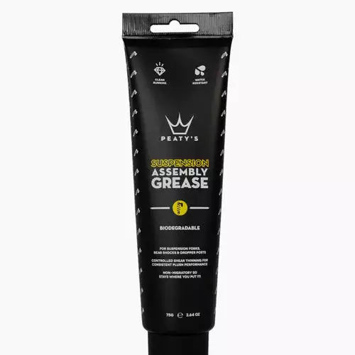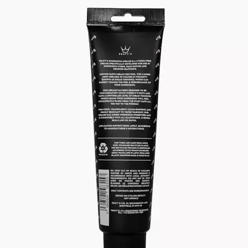 Peaty’s Suspension Grease on litiumvapaa rasva, joka on kehitetty erityisesti käytettäväksi jousitushaarukoissa, takaiskunvaimentimissa ja dropper-istuintolpissa. Myrkytön, läpinäkyvä, matalakitkainen ja vettähylkivä koostumus. Rasvaan on lisätty korroosion estoaineita, ja se on yhteensopiva kaikkien elastomeerien, o-renkaiden, tiivisteiden ja öljyjen kanssa.